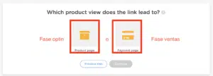 ¿A qué vista de producto conduce el enlace? Product page (optin) / Payment page (ventas) . . .Si te estás registrando durante la fase de optin, elige «Product page» , una vez finalice , redireccionaremos automáticamente a la página de pago